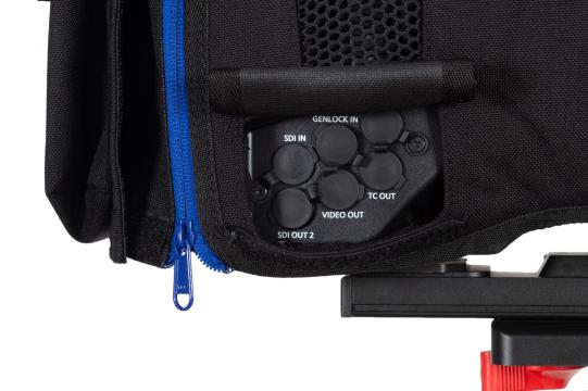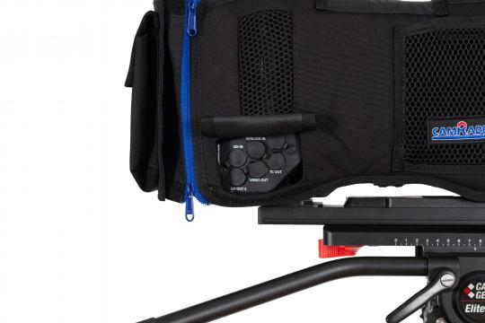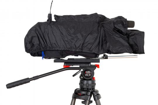 The camCover secures easily around the camera body with hook-and-loop fasteners, while leaving quick and easy access to its controls, memory card slots, connectors, viewfinder, lens, and battery. On the top of the camera, underneath the top handle, a rollable piece of fabric can be used to protect the ventilation unit.