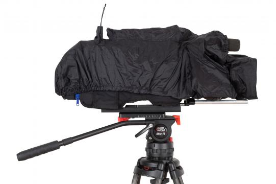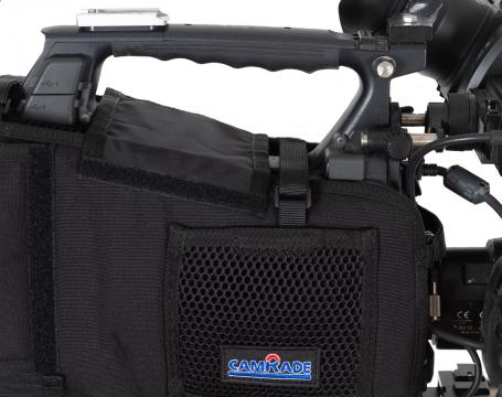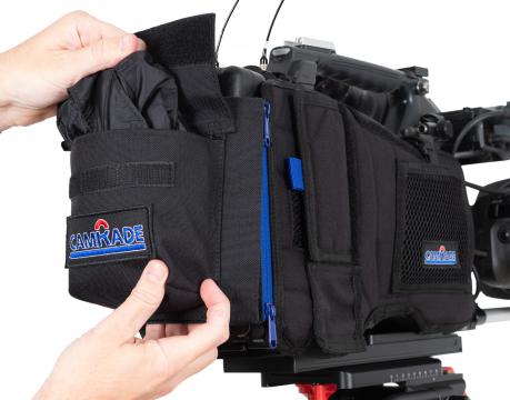 The camCover secures easily around the camera body with hook-and-loop fasteners, while leaving quick and easy access to its controls, memory card slots, connectors, viewfinder, lens, and battery. On the top of the camera, underneath the top handle, a rollable piece of fabric can be used to protect the ventilation unit.