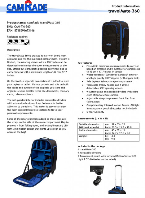 The travelMate 360 is created to carry on board most airplanes and fits the overhead compartment. If room is limited, the rotating wheels with a 360°radius can be detached to minimize the outer measurements of the bag. Strong but lightweight padding allows this bag to carry cameras with a maximum length of 45 cm/ 17.7 inches. On the front, a separate compartment is added to store your laptop or tablet. Various pockets and slits on both the inside and outside of the bag help you store and organize several smaller items like documents, memory cards, cables and tools.