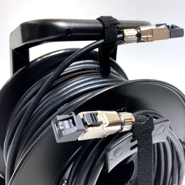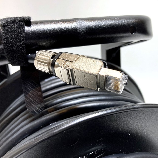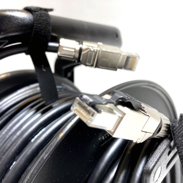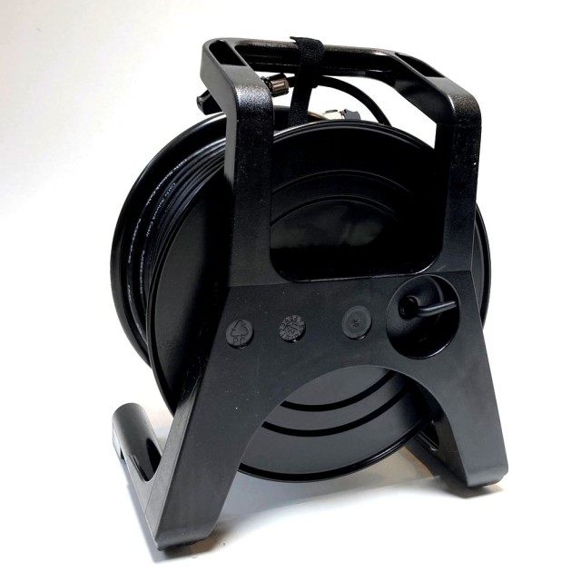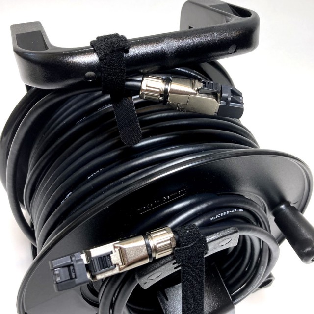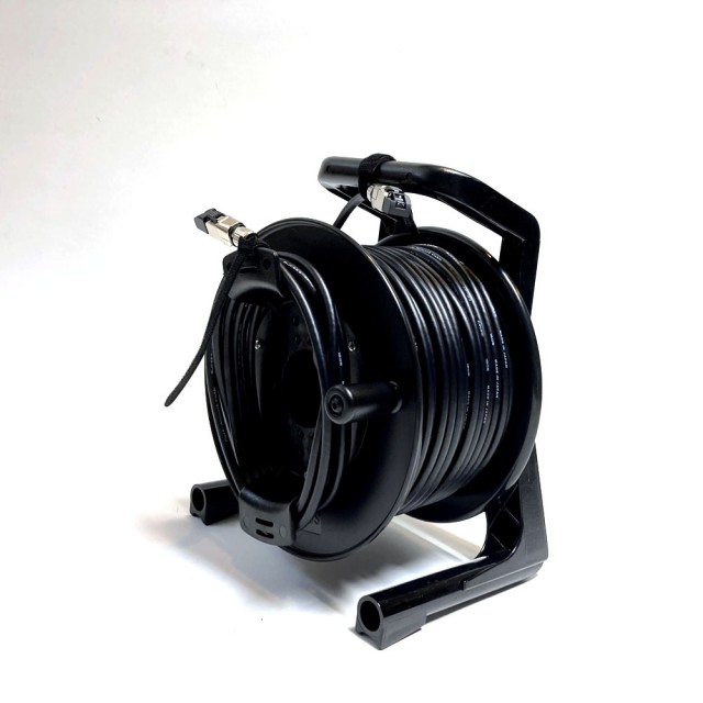 Flexibilný a extra silný Canare RJC5ES-4P-BS CAT5e STP sieťový kábel s vonkajším priemerom 6,7 mm s koncovkami Telegartner RJ45, navinutý na káblový bubon Schill. Ethernetové káble sa používajú nielen pre počítačové siete, ale tiež v poslednej dobe pre digitálne audio siete, sieťové kamery, HDBaseT prenosy. Celková dĺžka kábla je udávaná vrátane konektorov.
