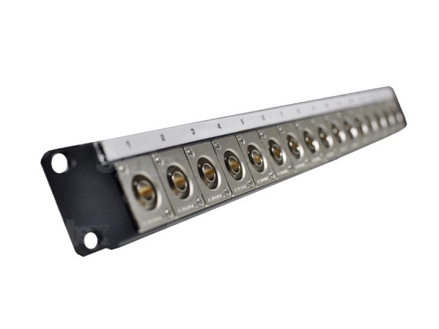 (F)Canare Patch panel BNC 19" 1U -equipped withdouble-sided BNC (F) / BNC (F)Canare BCJ-JRUDK adapters and cable holder on the back. Using the supplied metric screws in pre-drilled holes with pre-cut threads, the connectors are easily manipulatedwithout removing the patch panel from the rack!
