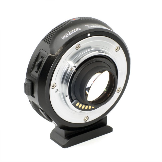 The new 0.64x Speed Booster reduces the full-frame crop factor of the BMCC from 2.39x to 1.53x, thus effectively transforming it into a Super-35 format cine camera. In addition, the speed of any attached lens is increased by11/3 stops, with a maximum output aperture of f/0.80.