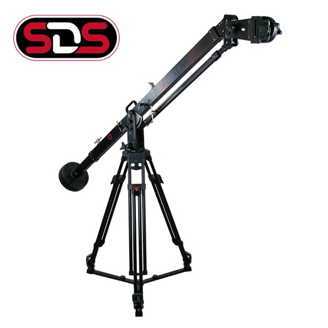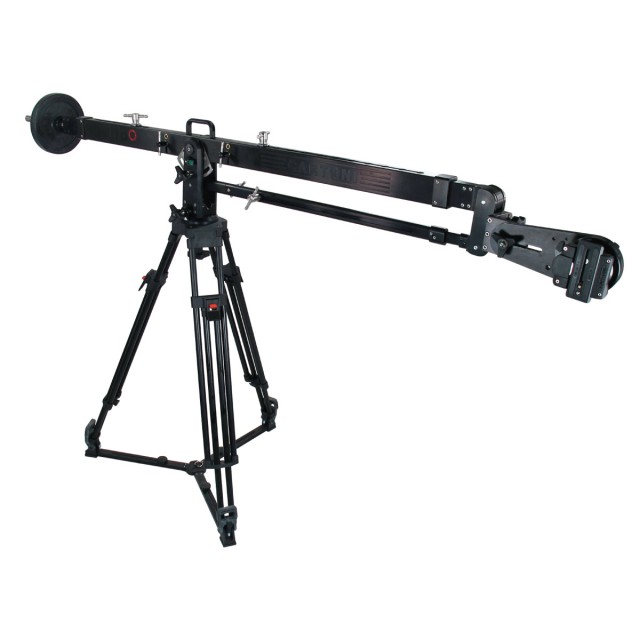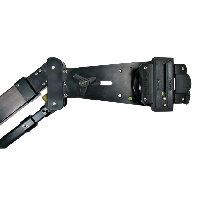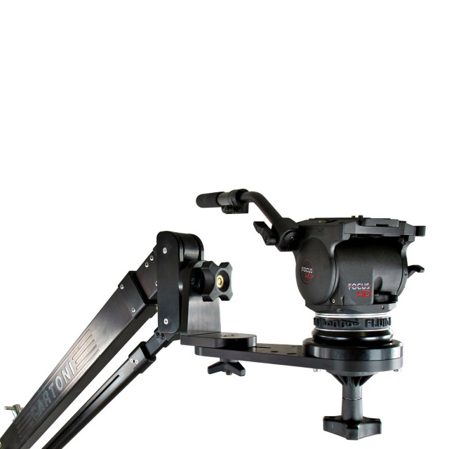 The rear part of the arm, which holds the counterweights, is extendible to provide for accurate camera balance; the typical counterweight kit is 25 kg of rubberized gym weights. The front telescopic arm permits the CARTONI JIBO to work in a wide variety of shooting positions or requirements, The fluid head supporting the camera can be positioned in several different positions as under-slung, side-ways, etc
