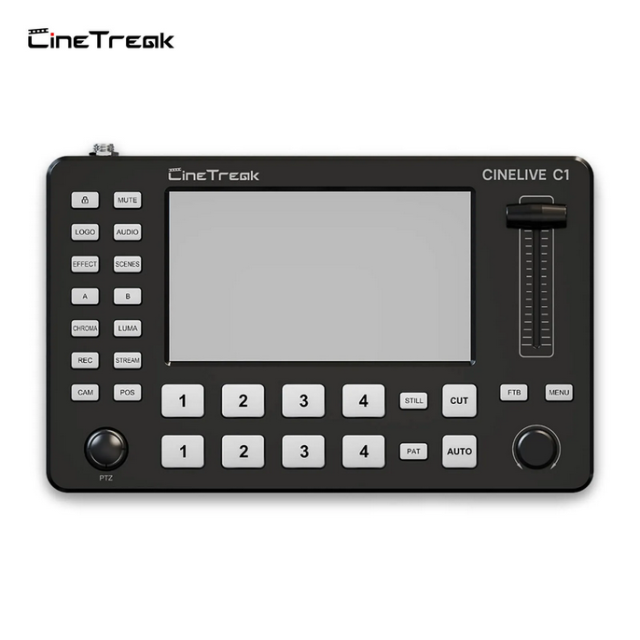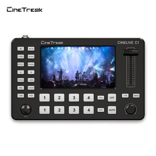 The CineTreak Cinelive C1 is a compact 5.5" HDMI video switcher designed for professional streaming, featuring 4 HDMI inputs, advanced chroma keying, built-in media library, PTZ control, and multi-platform RTMP live streaming.