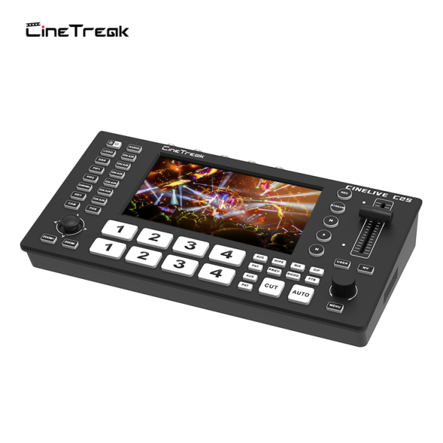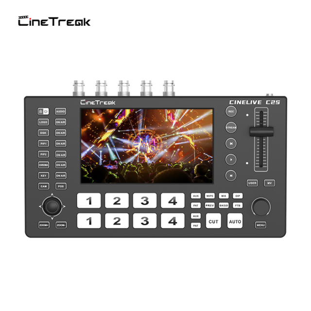 The CineTreak Cinelive C2S is a compact professional video switcher featuring a 5.5-inch touchscreen, hybrid HDMI/SDI input flexibility, PTZ camera control, dual RTMP streaming, and advanced chroma/luma keying. Built for modern livestreams and hybrid events, it combines power and portability in an aluminum-body design.
