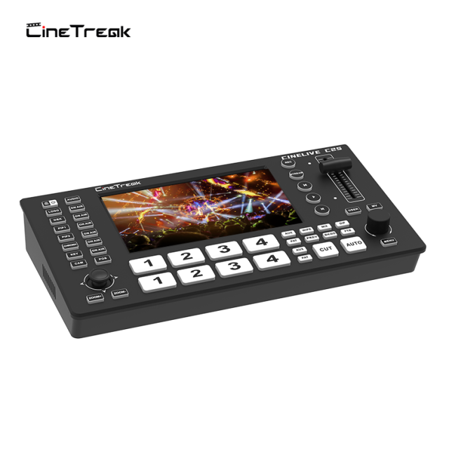 The CineTreak Cinelive C2S is a powerful and compact video mixer engineered for professional livestreaming and hybrid production environments. Housed in a durable aluminum panel, it boasts a 5.5-inch high-precision touchscreen and a streamlined design that delivers robust performance without sacrificing portability.