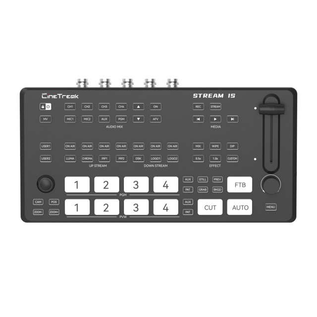 The CineTreak Stream 1S is a robust professional livestreaming switcher built to meet the demands of multi-camera live production. Featuring 4 SDI inputs, 1 PGM output, 1 PVW/AUX output, and 6 input channels including SDI, AUX, background media, and down-stream sources, it allows for dynamic, multi-layered live switching.