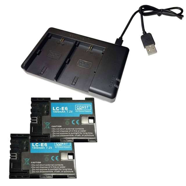 2pcs CONST LC-E6 (LP-E6), 7.2V 1800mAh batteries and CONST C-2E6 dual channel charger