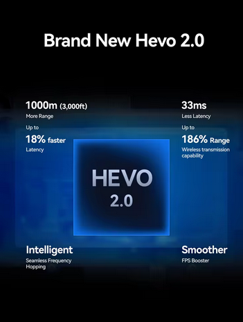 The Cosmo C2 operates on HEVO 2.0 technology, which ensures smooth, low-latency (≥33ms) transmission by automatically detecting and switching to the best frequency to avoid interference. The system can transmit video signals up to 1000 meters (3280 feet) in open areas, making it a great solution for live events, sports coverage, and large-scale productions.