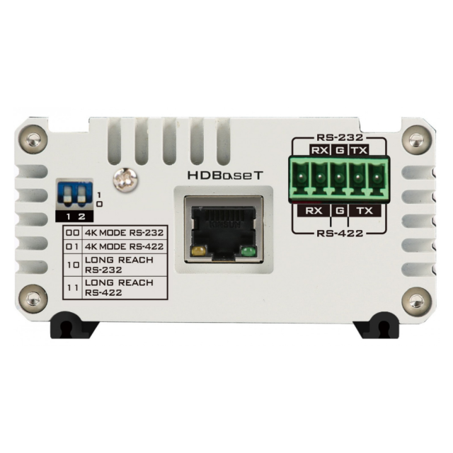 Receiver for PTZ cameras (PTC-140T/150T) with HDBaseT interface. Allows transmission of video, audio, DVIP commands (RJ-45), RS-422/232 commands (Phoenix interface) and PoE power over a single Cat.5e/6/6a/7 cable over distances up to 100m in FHD mode. HDMI output with support for formats 3840x2160p30/29.97/25/24/23.98, 1080p60/59.94/50/30/29.97/25/24/23.98, 1080i60/59.94/50, 720p60/59.94/50. Includes 48V= power supply and Phoenix > RJ-45 reducer.