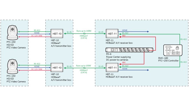 Receiver for PTZ cameras (PTC-140T/150T) with HDBaseT interface. Allows transmission of video, audio, DVIP commands (RJ-45), RS-422/232 commands (Phoenix interface) and PoE power over a single Cat.5e/6/6a/7 cable over distances up to 100m in FHD mode. HDMI output with support for formats 3840x2160p30/29.97/25/24/23.98, 1080p60/59.94/50/30/29.97/25/24/23.98,…