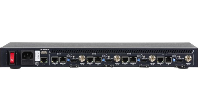 Datavideo HBT-50 is a 4-Channel HDBaseT receiver with SDI and HDMI outputs that supplies power, video signal, and camera control up to 4 devices up to 100 meters distance. HBT-50 can power the PTZ video cameras via PoE, transmit signals over a single ethernet cable to and from the camera and can be used to remotely control various camera parameters such as iris, presets and etc. Most importantly, it can output SDI signal to your switcher! HBT-50 simultaneously transmits SDI (up to 1080p60) and HDMI (up to 1080p60) as well as camera control. With the HBT-50, the system can be integrated camera controller, video switcher, and ISO recorder.