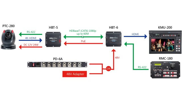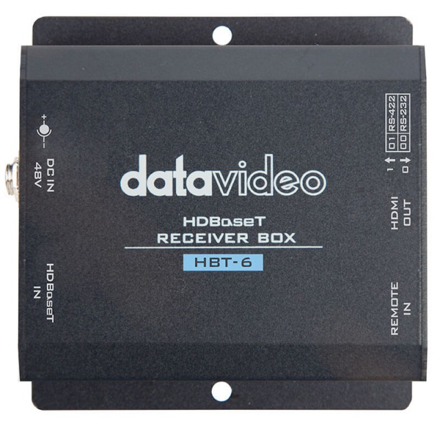 Receiver for HDBaseT interface for HDMI signal transmission up to 60 m in 1080p or 35 m in 4K@30 resolution using Cat 6 cable. Supports HDMI Deep Colour and Full 3D, resolution up to 4K/2K@30, HDCP 2.2/1.4, DTS-HD Master Audio and Dolby TrueHD audio etc. It also supports Power-over-Ethernet (PoE) power and RS-232/RS-422 commands. Comes with 48V= power supply.