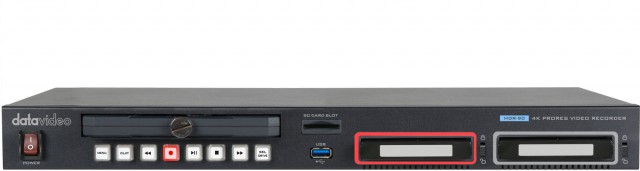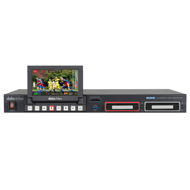 The Datavideo HDR-90 is a rackmount video recorder with LCD that controls and manages 10-bit ProRes data files with a 4:2:2 aspect ratio. The HDR-90 supports UHD 12G SDI I/O and 4K HDMI input/output, as well as DVIP (Ethernet), GPI and RS-232.