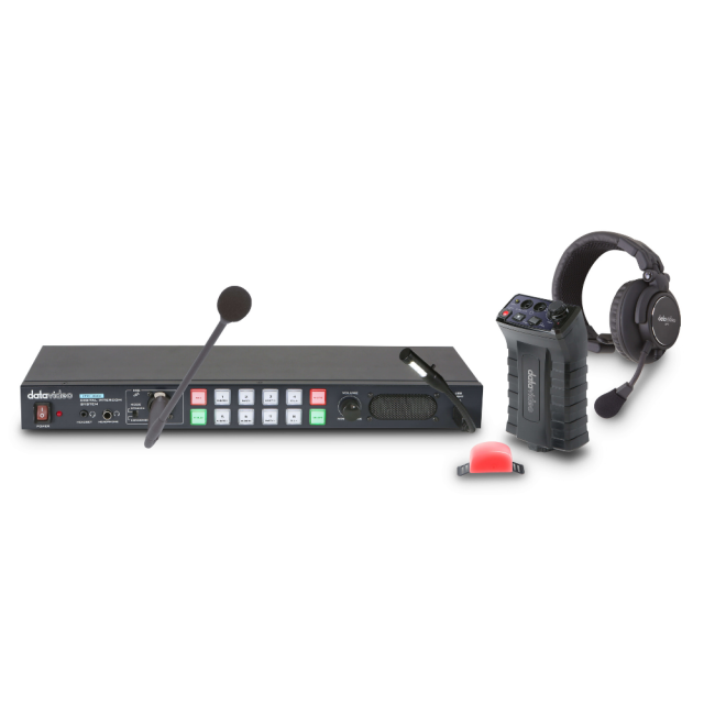 The Datavideo ITC-300 is an 8-channel single wired communication system, featuring power over Ethernet to 8 belt packs. The video director can select to talk to an individual channel or to all channels simultaneously.