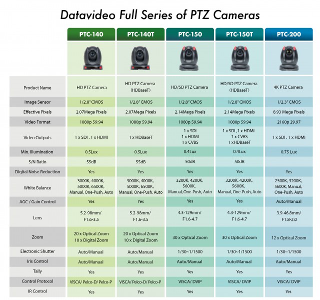 The PTC-150 features motorized 30x optical zoom capability, a wide dynamic range, backlight compensation, image mirror and rotation, and a tally light to indicate when the camera is active. Video outputs include 3G-SDI, HDMI, or CVBS ports that can simultaneously output video signals. The lens features a field of view range of 2.3 to 63.7° as well as an M52 filter thread to add a separately available filter. It also features 50 programmable position presets for your pan, tilt, and zoom operations.