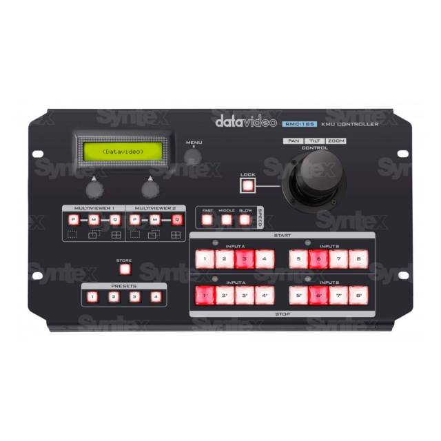 The RMC-185 is a cost effective physical controller designed specifically for control of the KMU-series 4K Multi-Camera Processor. The RMC-185 interfaces with the KMU-100 via an RS-422 interface. This dedicated controller allows operators to make smooth zoom and pan/tilt motions by using the joystick. Four presets are available that hold scale, position, motion path and speed of all four individual 3Gb/s outputs, per channel. Buttons allow start/stop/reset of motion in a predefined speed of every individual output.