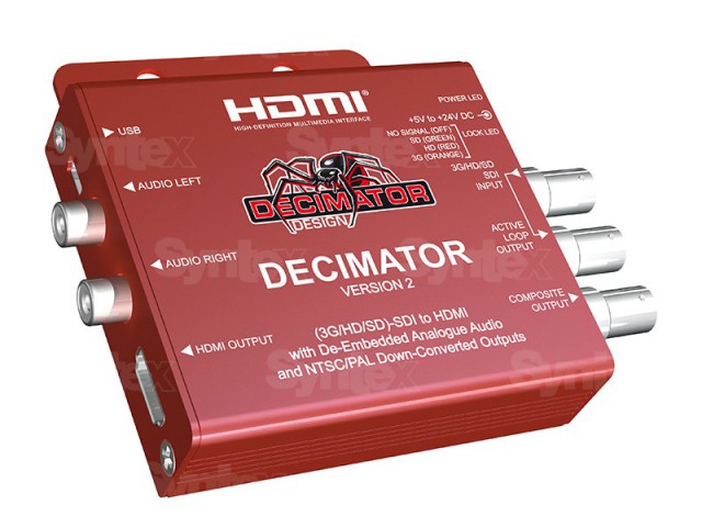 The functionality of the DECIMATOR 2 from Decimator Design has been upgraded via a new USB firmware update and it now simultaneously scales (3G/HD/SD)-SDI to both HDMI and and NTSC/PAL with de-embedded anaogue audio (via 2 x RCA connectors).