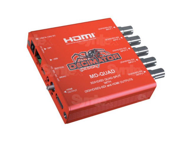 (3G/HD/SD)-SDI Quad Split with (3G/HD/SD)-SDI and HDMI Outputs. The MD-QUAD from Decimator Design is a low cost, miniature 3G/HD/SD-SDI 4 to 1 Quad Splitter or 4 to 1 input multiplexer, featuring linked (3G/HD/SD)-SDI and HDMI Outputs.