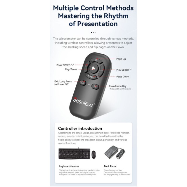 The teleprompter includes professional prompting software with an encryption dongle, ensuring secure and stable operation on Windows systems. Multiple control options are provided through the Bluetooth wireless remote and wired foot pedal, allowing presenters or operators to adjust scrolling speed and playback seamlessly. Designed for mobility, the entire system packs into a durable wheeled aluminum case, making transportation between studios and locations easy and safe.