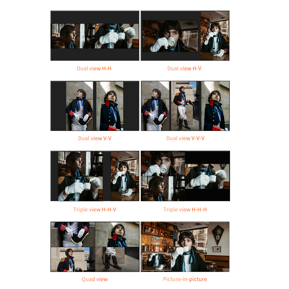 Horizontal & Vertical Monitoring As the industry pioneer of vertical-screen system, Desview equips the OL14/OL16 with eight monitoring modes (single, dual, triple, and quad-view split), supports free horizontal and vertical switching, replacing multiple traditional monitors with one unit, perfect for vertical short dramas, short videos, and live streams. |