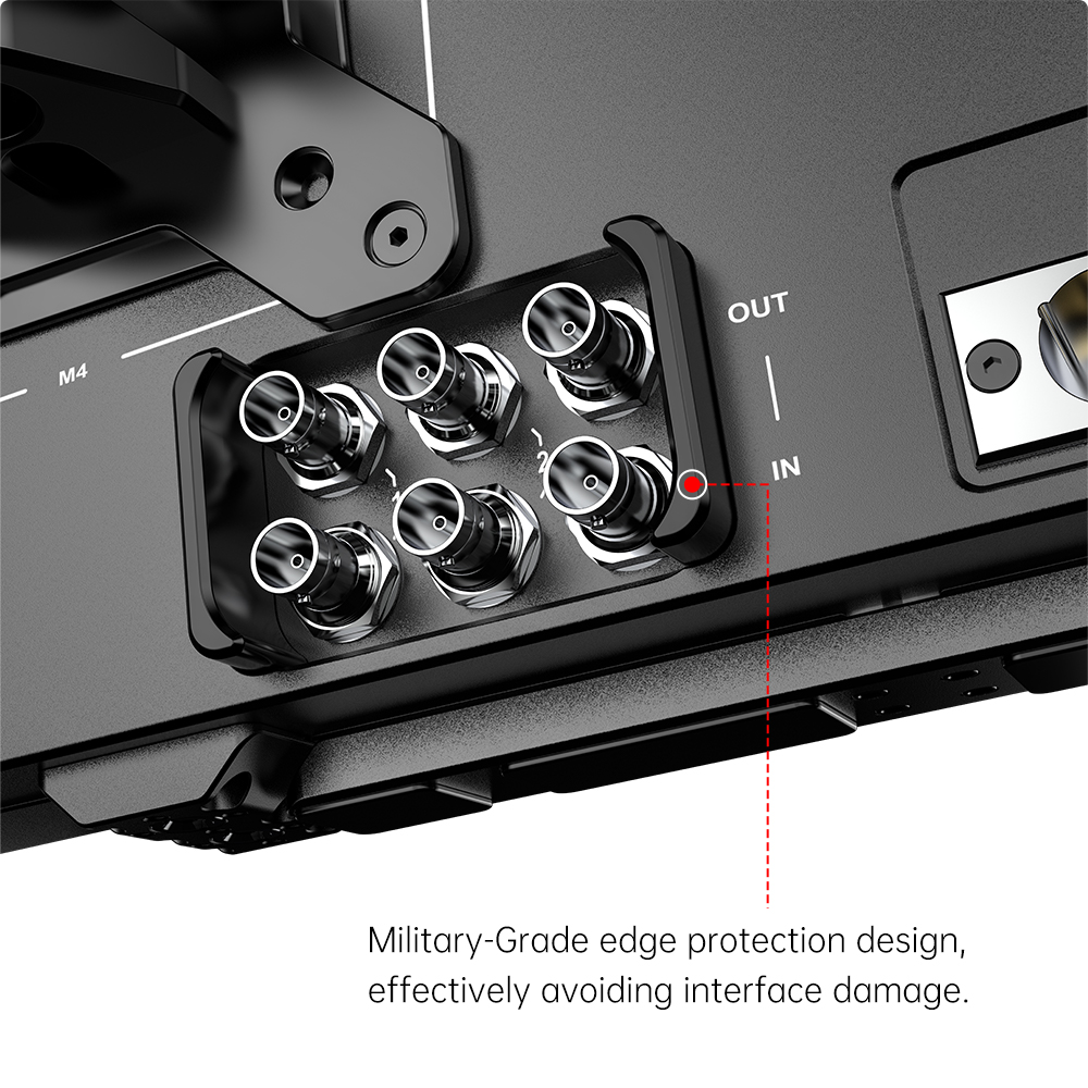 Professional-Grade SDI Interface It provides three-channel SDI input / loopout, providing flexibility and diversity for your creation, easily connects with multiple devices, and release unlimited possibilities of creation. Military-Grade edge protection design, effectively avoids interface damage.