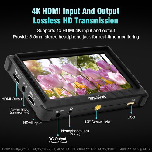 The Desview P5II is a compact 5.5-inch on-camera monitor with Full HD 1920 × 1080 resolution, 800 cd/m² brightness, HDR support, and advanced monitoring tools including false color, focus peaking, and waveform. It supports HDMI input up to DCI 4K24, custom 3D LUTs, and offers flexible power options via L-Series battery or DC input.