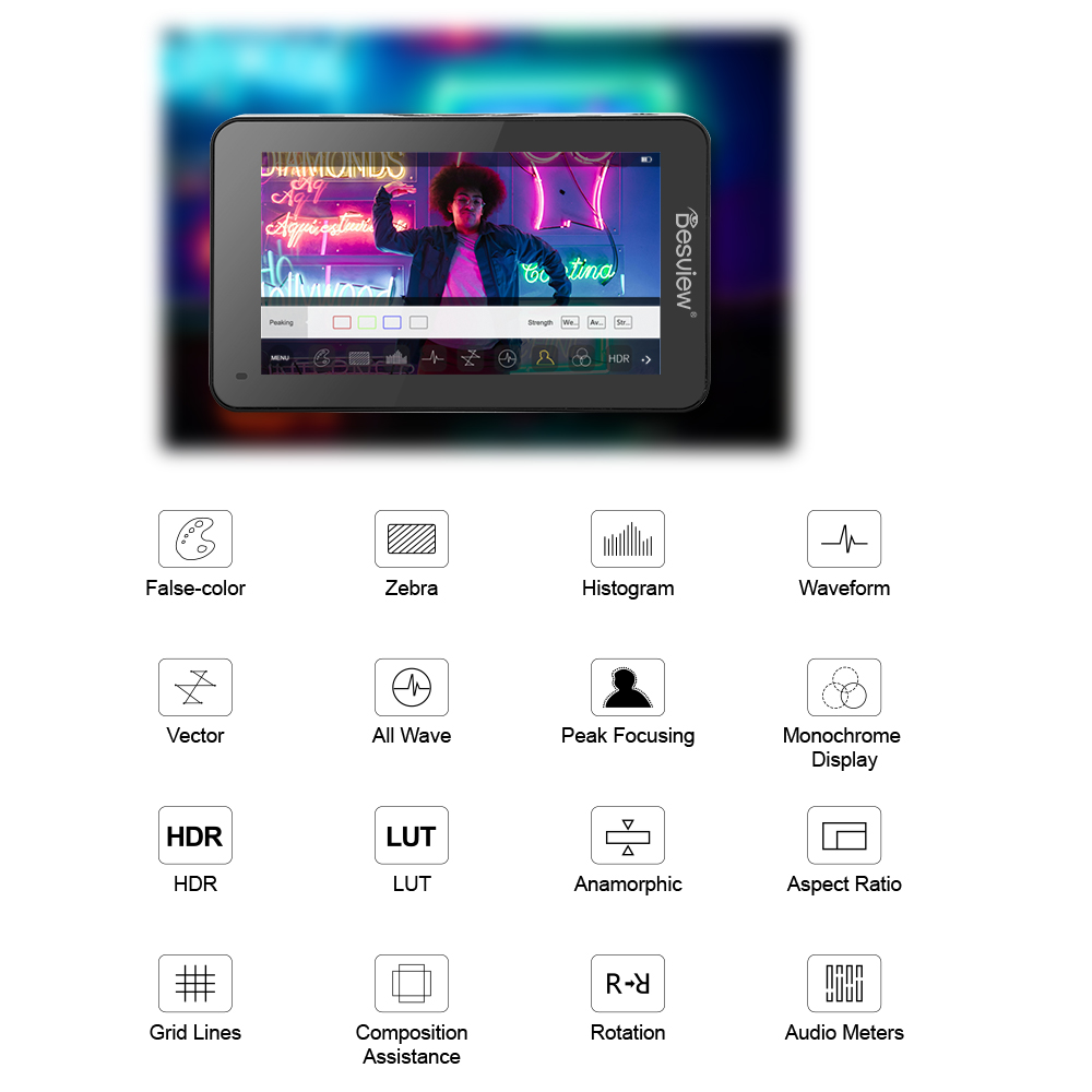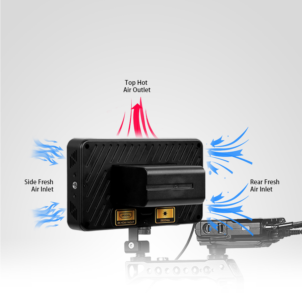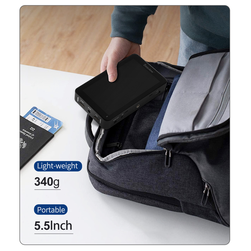 High Brightness Compact 4K Monitor. 5.5-Inch Monitor with Precise Image Analysis. 1600 Nits High Brightness, 4Kp30 HDMI, HDR Monitoring, Custom 3D LUT, Full HD touchscreen display. Magnetic Hood Quick Installation and Disassembly. With a screen size of 5.5 inches and a weight of only 340g, it easily breaks through shooting scene restrictions, presenting an efficient.