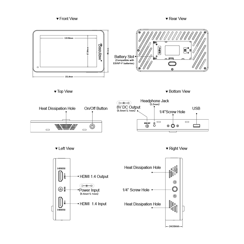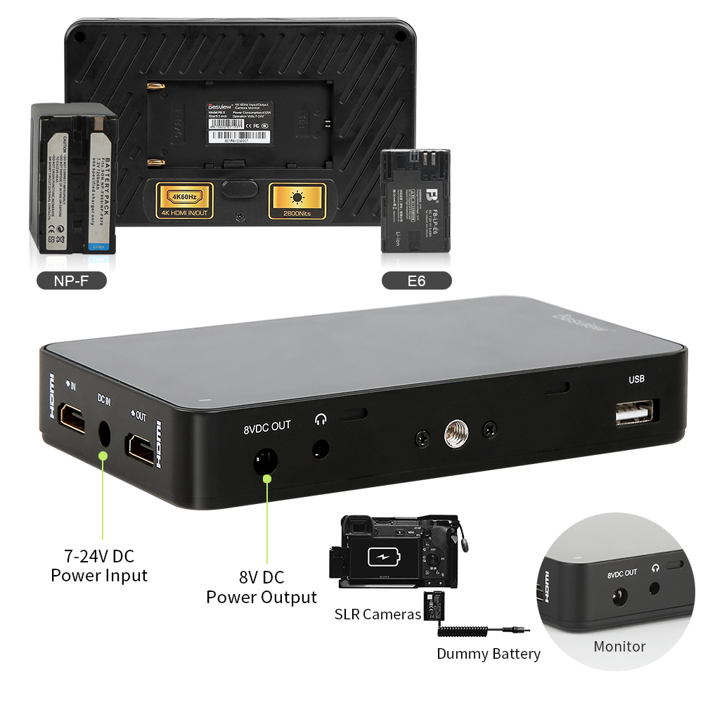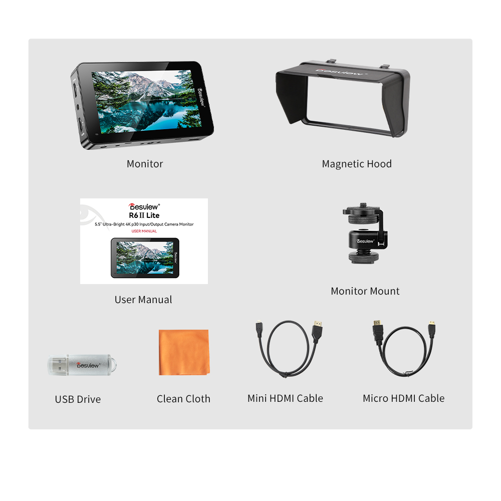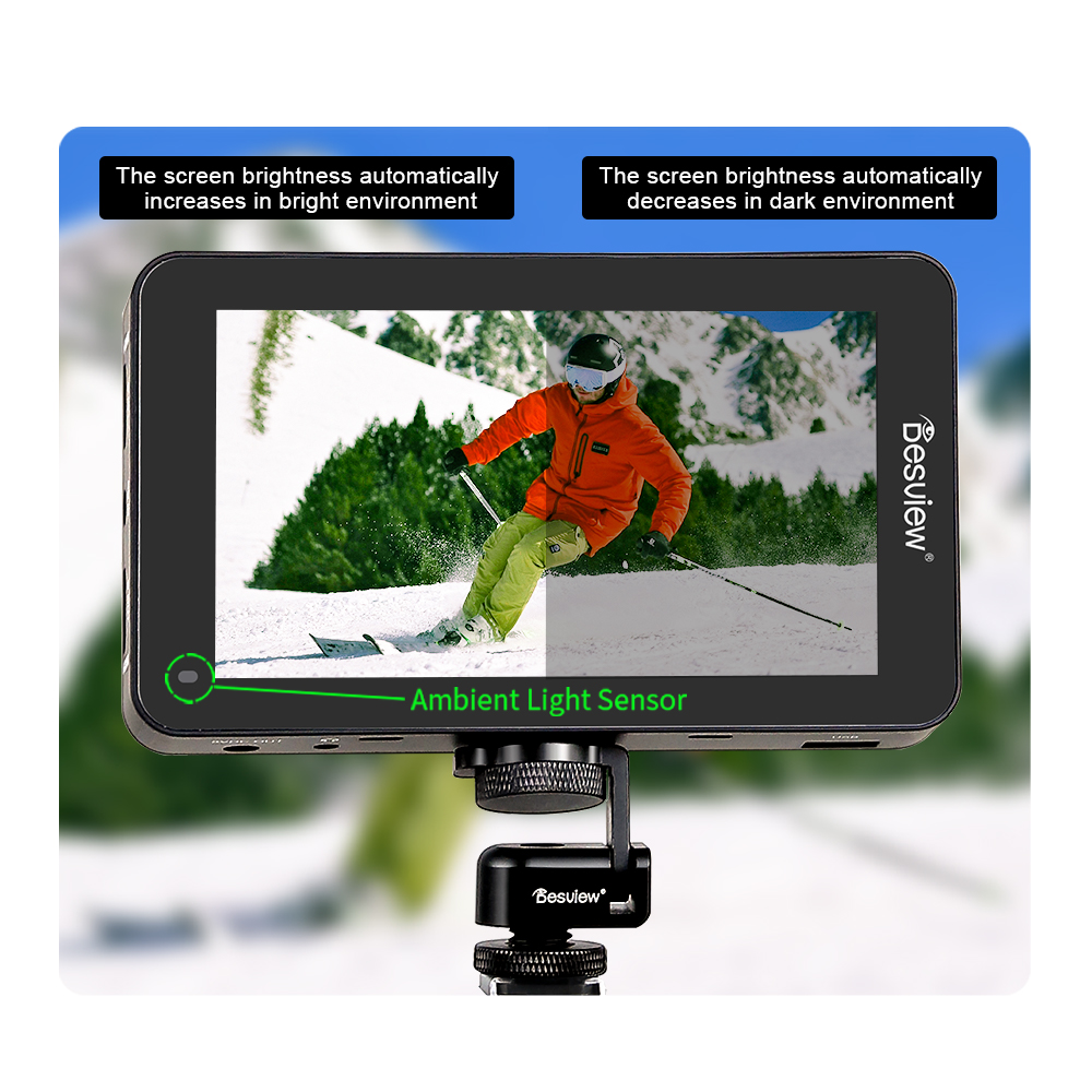 High Brightness Compact 4K Monitor. 5.5-Inch Monitor with Precise Image Analysis. 1600 Nits High Brightness, 4Kp30 HDMI, HDR Monitoring, Custom 3D LUT, Full HD touchscreen display. Magnetic Hood Quick Installation and Disassembly. With a screen size of 5.5 inches and a weight of only 340g, it easily breaks through shooting scene restrictions, presenting an efficient.