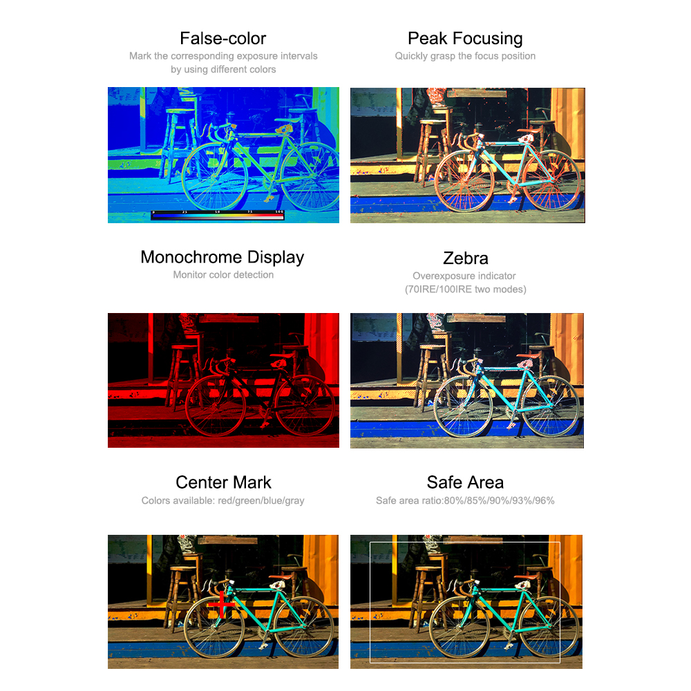 Complete Monitoring Features Equipped with complete auxiliary shooting functions, including full waveform, color temperature,peak focus, pseudo-color, deformation function, zebra line, still image, and other professional software functions, making shooting simpler |