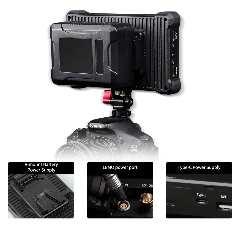HDMI/SDI monitor supports dual NP-F batteries, DC input, and Type-C power supply, providing a user-friendly multiple power supply system, allowing you to bid farewell to battery anxiety. Upgraded to support 4K input at 60Hz and with loop output, ensuring impeccable preservation of high frame rate dynamic images and enhanced monitoring experience.