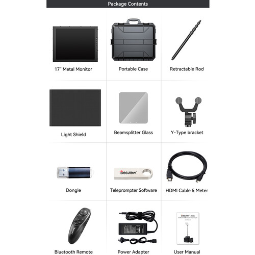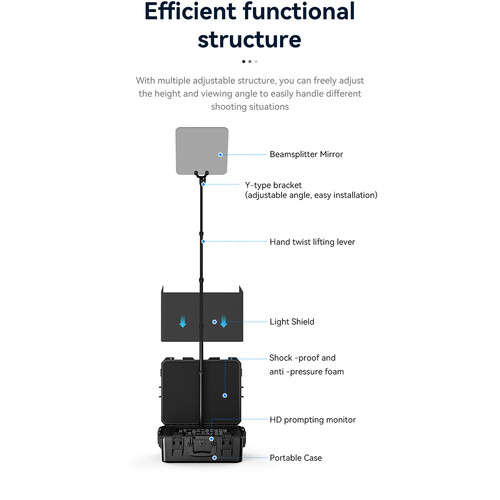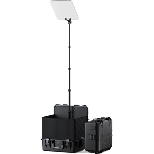 A height-adjustable rod (1.5 to 5.5 feet) allows for customized positioning, accommodating different shooting environments. The hard case doubles as a stand, providing both portability and stability for on-the-go productions. The included Bluetooth remote ensures wireless script control, and the sunshade minimizes glare, ensuring clear readability even in bright conditions.