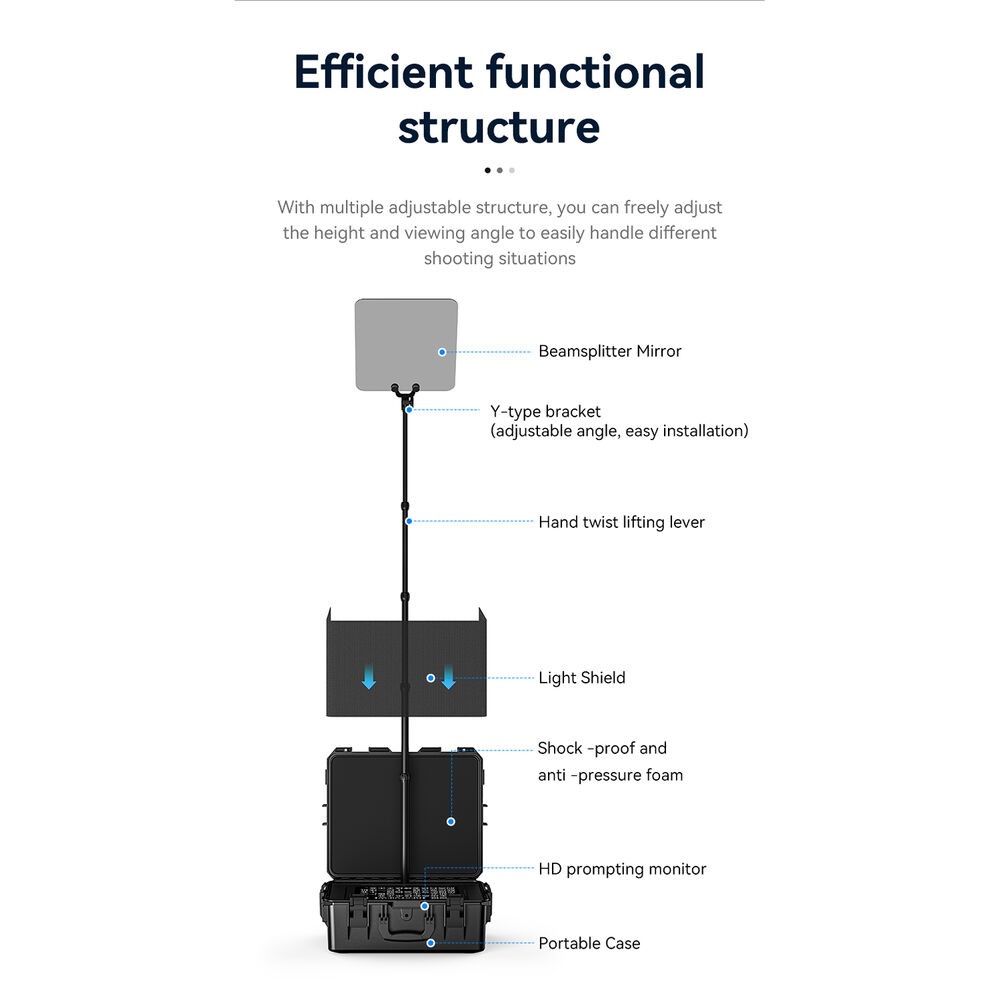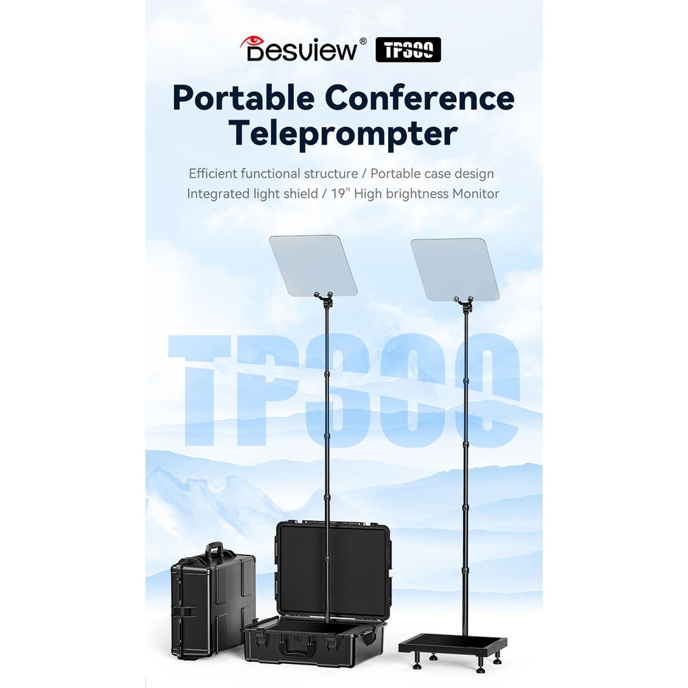 The Desview TP300 is a portable, presidential-style teleprompter system designed for speeches, conferences, and live presentations, featuring a high-brightness 19" monitor and reflective mirror glass for clear, natural eye contact with the audience in any lighting condition.