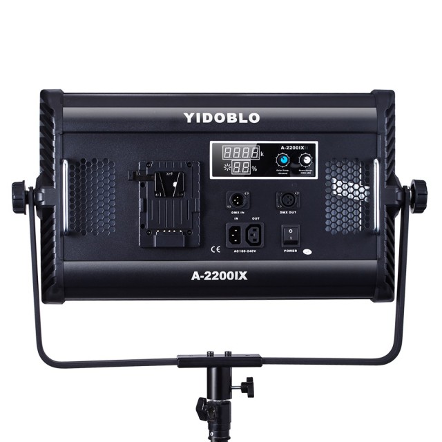 Digital display: yes. Material: aluminium. Colour temperature: two-colour 3200-5600K ± 300K dimmable. Power:100W. 648pcs SMD LEDs. Light angle: 120. Luminous flux:20000LM. CRI:RA97. Battery support:SONY battery F550/750/970 + V-mount battery clip (optional). AC input: AC: 85V-265V 50Hz- 60Hz DC: 15V5A. Light size:51*29*6cm