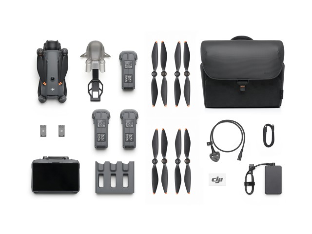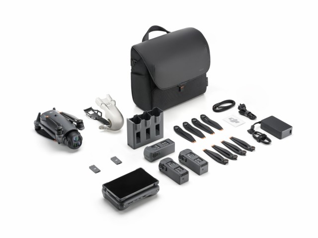 The DJI Mavic 4 Pro is a camera drone with three lenses. The 512GB Creator Combo version includes built-in 512GB SSD storage, a DJI RC Pro 2 remote with a 7-inch extra-bright Mini-LED display, a 240W power adapter, a USB-C ↔ USB-C high-speed data cable, two additional batteries, a parallel charging hub, a shoulder bag and other accessories.