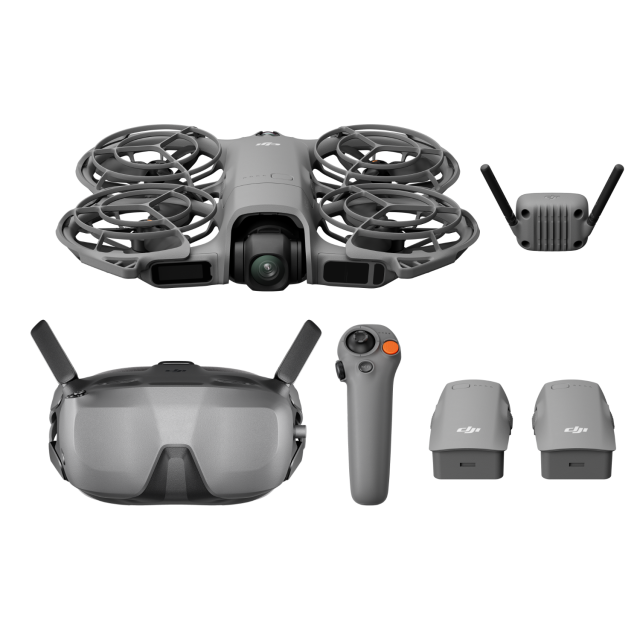 The DJI Neo 2 is DJI's most compact drone, equipped with omnidirectional obstacle sensing and features such as gesture control, SelfieShot, and ActiveTrack, which enable more creative ways of flying. The kit includes the drone, RC Motion 3, Goggles N3, three Intelligent Flight Batteries, Two-Way Charging Hub, Digital Transceiver, propeller guards, and other accessories.