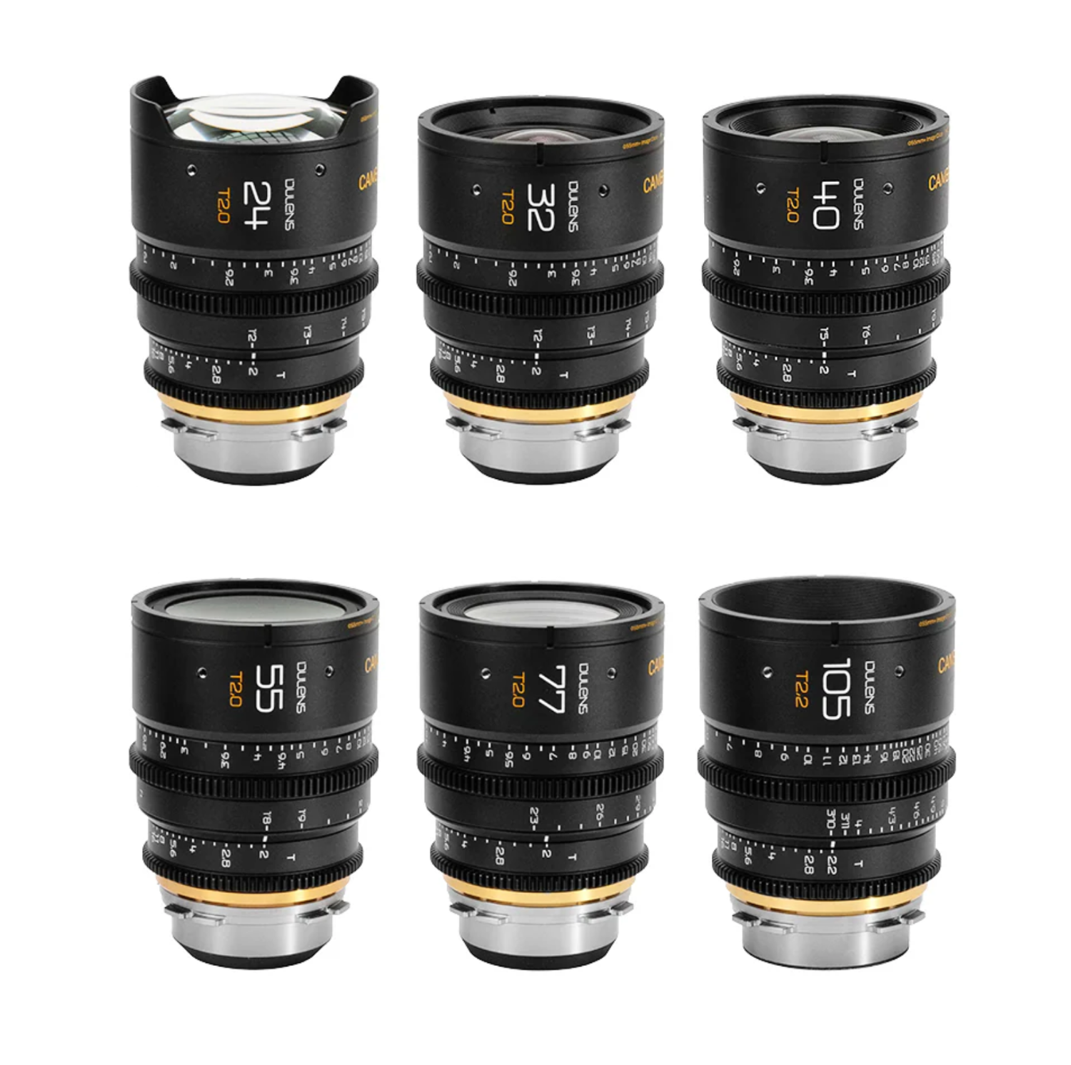 Dulens APO Cambrian Prime 6-Lens Kit (24/32/40/55/77/105mm T2.0) PL Mount Black Metric: Full medium-format/Vista Vision/large-format cinema primes with APO spherical design, ultra-wide T2.0 aperture, creamy vintage-style bokeh, uniform 80mm front diameter, lightweight aluminum build (<850g each), V+ coating for nostalgic flare and micro-contrast—ideal for professional narrative, commercial, and large-sensor filmmaking.