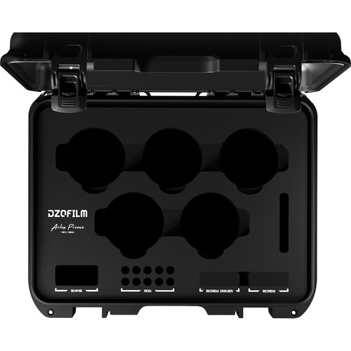Use this Hard Case with Foam Insert from DZOFilm to safely transport and protect a set of five Arles cine-style prime lenses. It has a waterproof exterior, a pressure equalization valve, and a foam interior with custom cutouts to cushion and protect your lenses. The case has a flip-up handle that folds out of the way for storage and two latches keep the lid securely closed. It accepts user-supplied padlocks for additional security options.