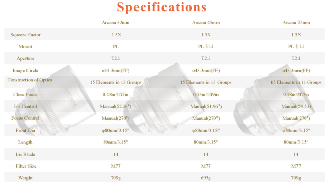 3-lens anamorphic prime set: 32mm, 45mm, 75mm