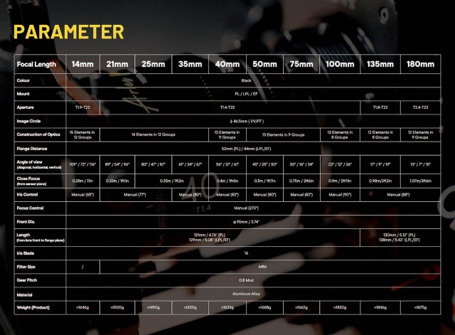 | F-stop | T/1.9-T/22 | T/1.4-T/22 | T/1.8-T/22 | T/2.4-T/22 | |