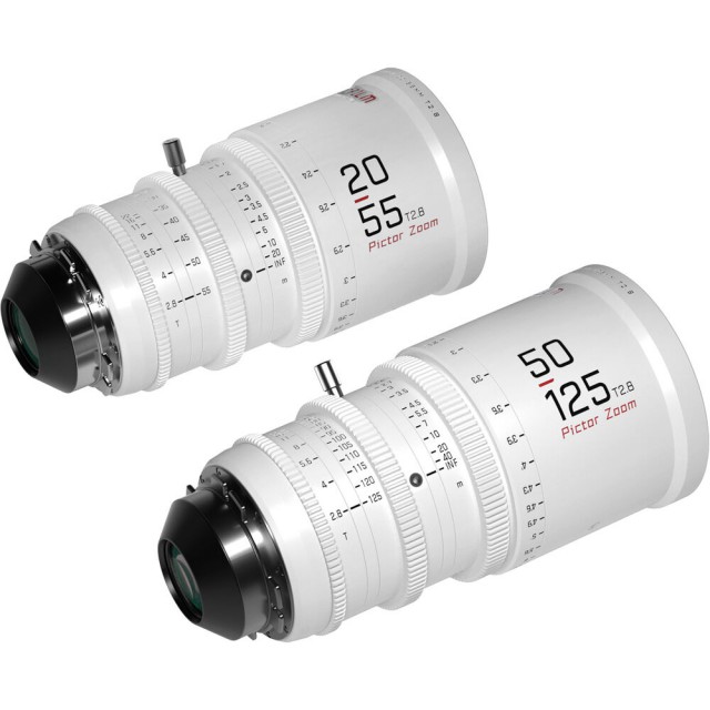 A set of DZOFilm Pictor 50-125mm T2.8 S35 and DZOFilm Pictor 20-55mm T2.8 S35 lenses in white color.