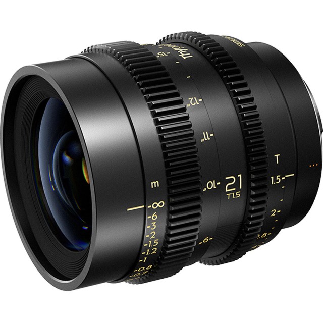 The DZOFilm/Thypoch Simera-C fixed-focal film lenses offer T/1.5 aperture, lightweight construction (390-470 g depending on model), M0.8 aperture and focusing rings for easy side focus installation, 16 aperture blades for smooth rendering of scenes beyond depth of field, and high-quality optics including ED and aspherical elements for good sharpness and minimized color defects.
