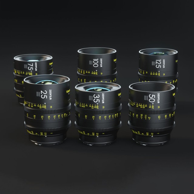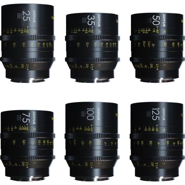 This DZOFilm VESPID 6-Lens Kit A is suitable for use on productions ranging from independent to studio films. The included 25, 35, 50, 75, 100, and 125mm EF mount lenses cover full-frame sensors and project a 46.5mm image circle yet are small and lightweight, making them an excellent choice for handheld, gimbal, and drone work.