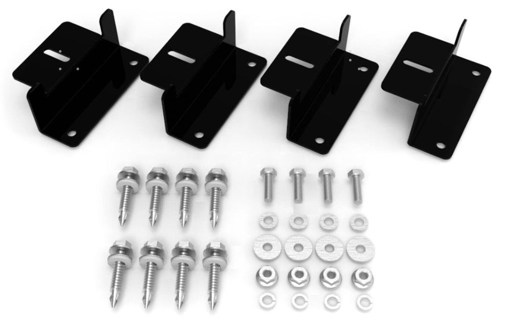 The EcoFlow 1ECOPK01-02 Fixed Solar Panel Mounting Kit is a complete set of mounting hardware that allows you to securely attach EcoFlow solar panels to a variety of surfaces. Each kit includes “Z” brackets, bolts, washers, nuts, and self-tapping screws with plastic lock rings, ensuring a stable and durable installation.
