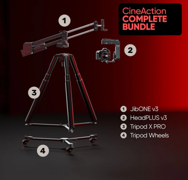 The Edelkrone CineAction Bundle - Complete combines the JibONE v3, HeadPLUS v3, Tripod X PRO, and Tripod Wheels, offering an all-in-one solution for smooth, professional-grade cinematic shots with precise motion control.