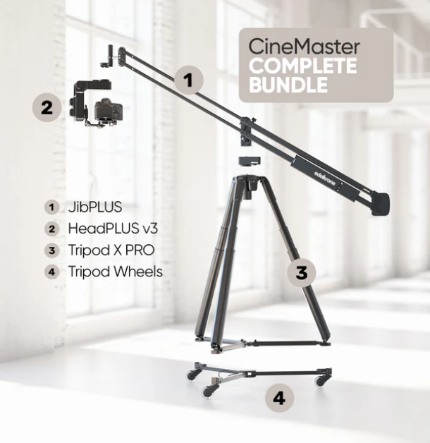 The Edelkrone CineMaster Bundle - Complete includes the JibPLUS, HeadPLUS v3, Tripod X PRO, and Tripod Wheels, providing a comprehensive motion control system for creating smooth and precise cinematic shots.