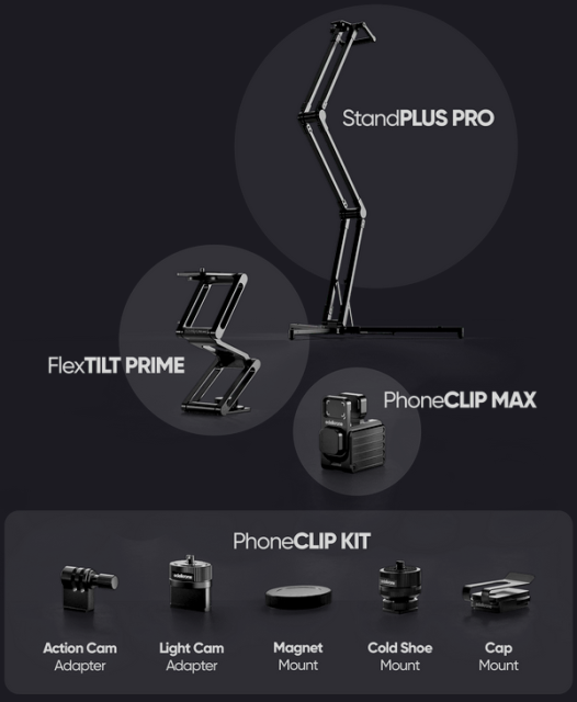 Everything you need to mount, position, and shoot with any camera or phone—instantly. The Creator Essentials Bundle includes StandPLUS PRO, FlexTILT PRIME, PhoneCLIP MAX, and the full PhoneCLIP KIT.
