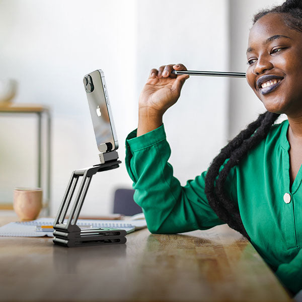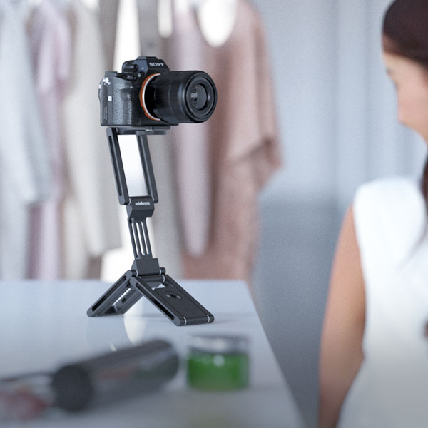 Pocket-sized acrobat stand for absolute freedom on tripod, on table, on ground.