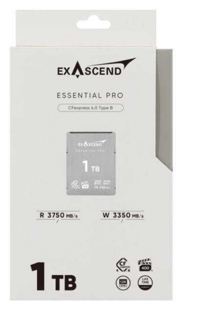 The Exascend EXPC4EB001TB Essential Pro CFexpress 4.0 Type B 1TB card empowers creators with 3750 MB/s read and 3350 MB/s write speeds for seamless 8K/12K 120fps video. VPG-400 certified, it features Adaptive Thermal Control, high endurance (600TB TBW), and lifetime warranty with data recovery.