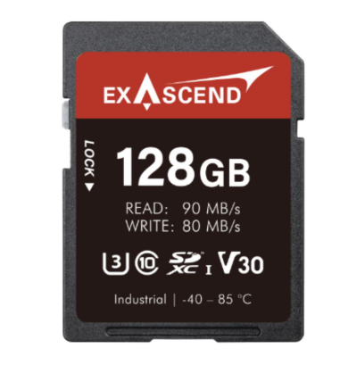 The Exascend EX128GSDV30-IDE is a 128 GB Industrial SDXC card (SD300 Series) with 3D TLC / pSLC NAND, delivering up to 90 MB/s read and 80 MB/s write speeds. Rated V30/U3/C10/A2, it operates from -40°C to +85°C with SMART health monitoring, 2,000,000-hour MTBF, and 2.7–3.6 V input—ideal for rugged 4K surveillance, embedded, and industrial systems.